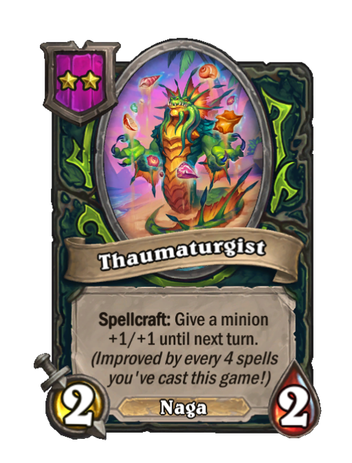 Thaumaturgist is a Tier 2 Naga Minion in Hearthstone Battlegrounds with 2/2 stats featuring Spellcraft. Effect: Spellcraft: Give a minion +1/+1 until next turn. (Improved by every 4 spells ________you've cast this game!)_____. This card is no longer in the pool (Legacy).