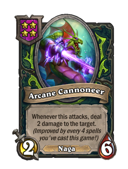 Arcane Cannoneer is a Tier 4 Naga Minion in Hearthstone Battlegrounds with 2/6 stats. Effect: Whenever this attacks, deal 2 damage to the target. (Improved by every 4 spells ________you've cast this game!)_____. This card is no longer in the pool (Legacy).