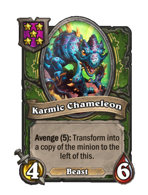 Karmic Chameleon is a Tier 5 Beast Minion in Hearthstone Battlegrounds with 4/6 stats featuring Avenge. Effect: Avenge (5): Transform into a copy of the minion to the left of this. This card is no longer in the pool (Legacy).