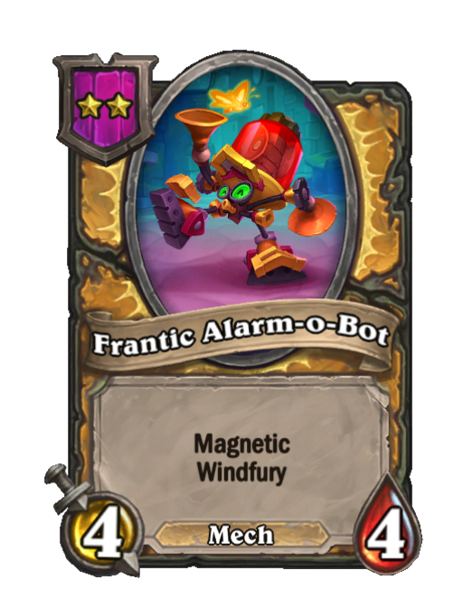 Frantic Alarm-o-Bot is a Tier 2 Mech Minion in Hearthstone Battlegrounds with 4/4 stats featuring Windfury, Magnetic. Effect: Magnetic Windfury. This card is no longer in the pool (Legacy).