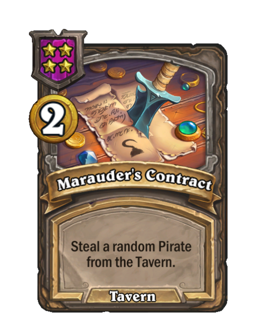 Marauder's Contract is a Tier 4 Spell in Hearthstone Battlegrounds (Tavern). Effect: Steal a random Pirate from the Tavern. Costs 2 Gold. This card is no longer in the pool (Legacy).