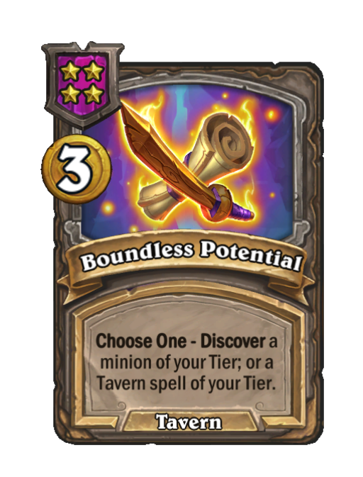 Boundless Potential is a Tier 4 Spell in Hearthstone Battlegrounds featuring Choose One (Tavern). Effect: Choose One - Discover a minion of your Tier; or a Tavern spell of your Tier. Costs 3 Gold. This card is no longer in the pool (Legacy).