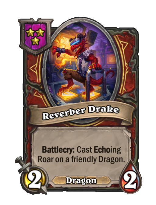 Reverber Drake is a Tier 3 Dragon Minion in Hearthstone Battlegrounds with 2/2 stats featuring Battlecry. Effect: Battlecry: Cast Echoing Roar on a friendly Dragon. This card is no longer in the pool (Legacy).