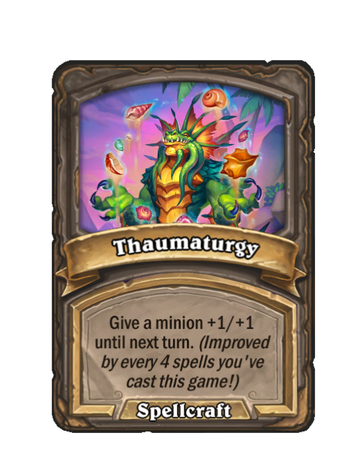 Thaumaturgy is a Spell in Hearthstone Battlegrounds (Spellcraft). Effect: Give a minion +1/+1 until next turn. (Improved by every 4 spells you've cast this game!). Created by: Thaumaturgist. This card is no longer in the pool (Legacy).