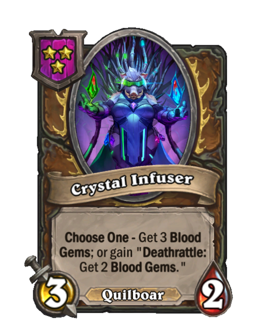 Crystal Infuser is a Tier 3 Quilboar Minion in Hearthstone Battlegrounds with 3/2 stats featuring Choose One. Effect: Choose One - Get 3 Blood Gems; or gain "Deathrattle: Get 2 Blood Gems.". This card is no longer in the pool (Legacy).