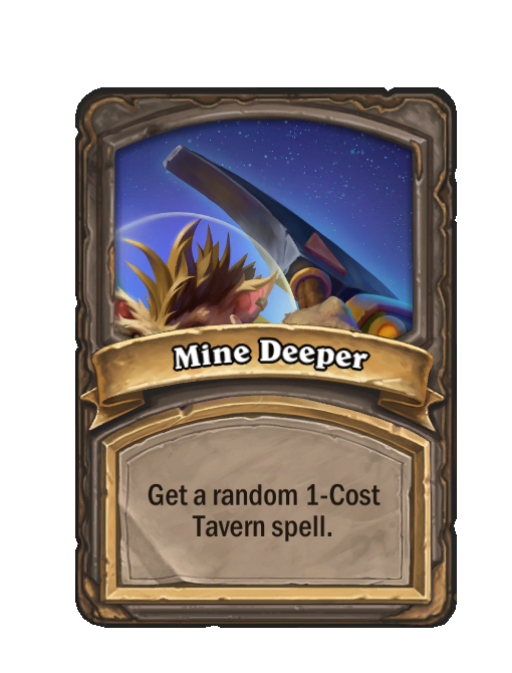 Mine Deeper is a Spell in Hearthstone Battlegrounds. Effect: Get a random 1-Cost Tavern spell. Created by: Crater Miner. This card is no longer in the pool (Legacy).