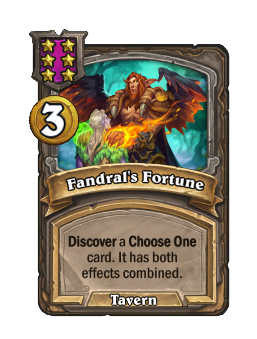Fandral's Fortune is a Tier 6 Spell in Hearthstone Battlegrounds featuring Discover (Tavern). Effect: Discover a Choose One card. It has both effects combined. Costs 3 Gold. This card is no longer in the pool (Legacy).