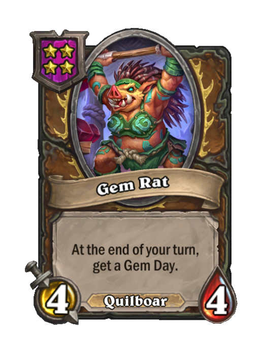 Gem Rat is a Tier 4 Quilboar Minion in Hearthstone Battlegrounds with 4/4 stats featuring End of Turn. Effect: At the end of your turn, get a Gem Day. This card is no longer in the pool (Legacy).
