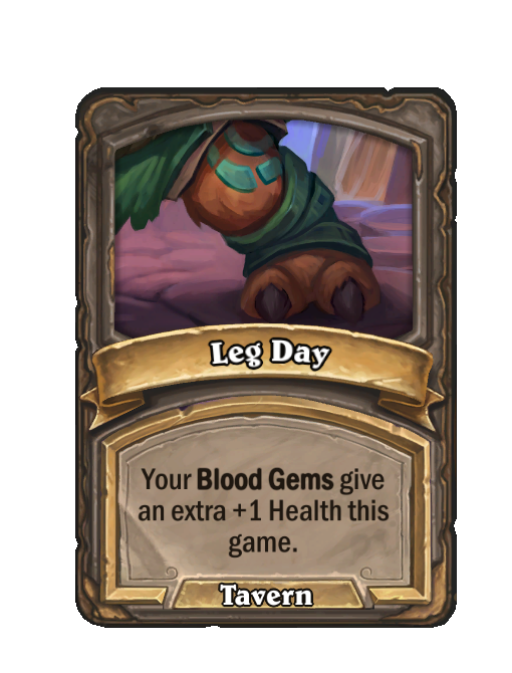 Leg Day is a Spell in Hearthstone Battlegrounds. Effect: Your Blood Gems give an extra +1 Health this game. Created by: Gem Rat. This card is no longer in the pool (Legacy).