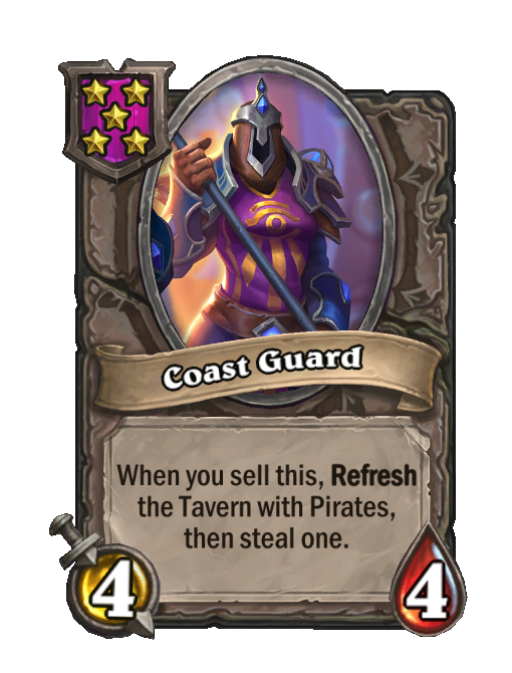 Coast Guard is a Tier 5 Minion in Hearthstone Battlegrounds with 4/4 stats featuring Refresh. Effect: When you sell this, Refresh the Tavern with Pirates, then steal one. This card is no longer in the pool (Legacy).