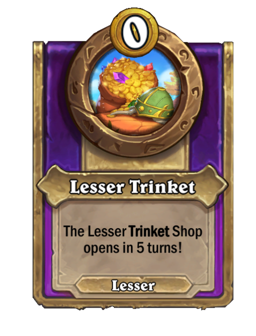 Lesser Trinket is a Trinket in Hearthstone Battlegrounds. Effect: The Lesser Trinket Shop opens in 5 turns!. This card is no longer in the pool (Legacy).