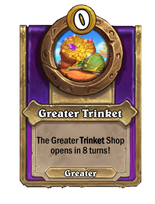 Greater Trinket is a Trinket in Hearthstone Battlegrounds. Effect: The Greater Trinket Shop opens in 8 turns!. This card is no longer in the pool (Legacy).