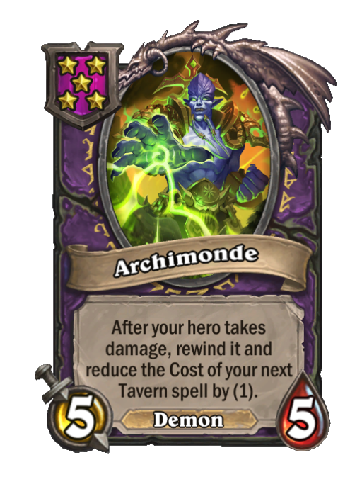 Archimonde is a Tier 5 Demon Minion in Hearthstone Battlegrounds with 5/5 stats. Effect: After your hero takes damage, rewind it and reduce the Cost of your next Tavern spell by (1). This card is no longer in the pool (Legacy).