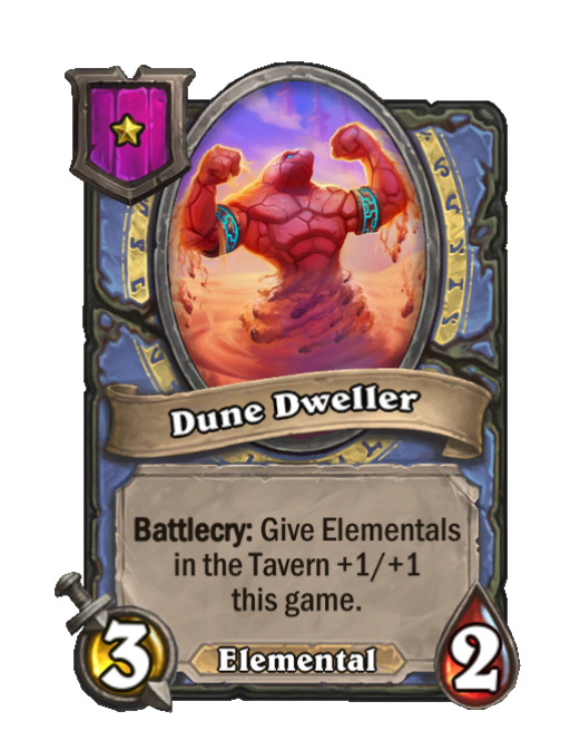 Dune Dweller is a Tier 1 Elemental Minion in Hearthstone Battlegrounds with 3/2 stats featuring Battlecry. Effect: Battlecry: Give Elementals in the Tavern +1/+1 this game.
