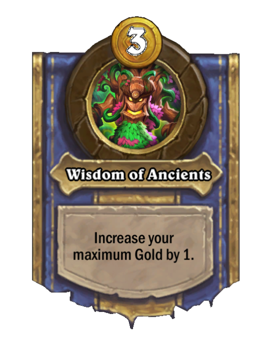 Wisdom of Ancients is a Hero Power in Hearthstone Battlegrounds. Effect: Increase your maximum Gold by 1. Costs 3 Gold. Created by: Forest Lord Cenarius.