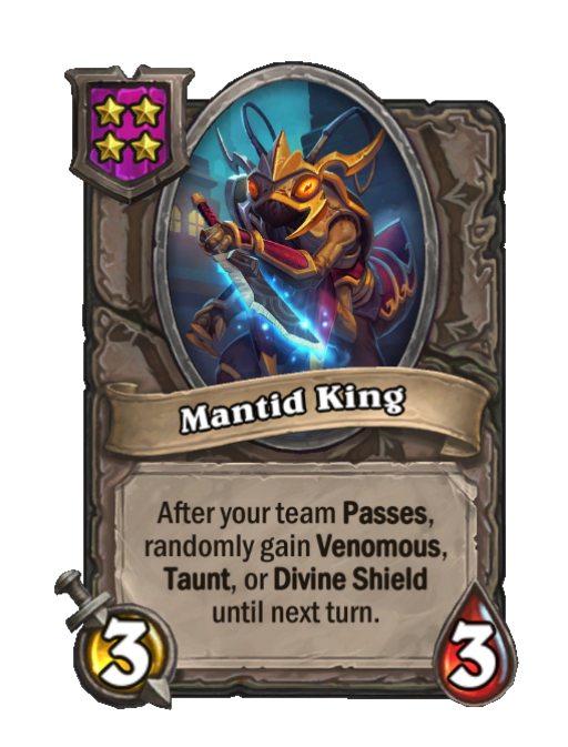 Mantid King is a Tier 4 Minion in Hearthstone Battlegrounds with 3/3 stats. Effect: After your team Passes, randomly gain Venomous, Taunt, or Divine Shield until next turn.