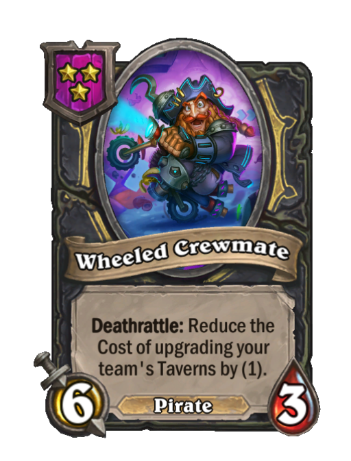 Wheeled Crewmate is a Tier 3 Pirate Minion in Hearthstone Battlegrounds with 6/3 stats featuring Deathrattle. Effect: Deathrattle: Reduce the Cost of upgrading your team's Taverns by (1).