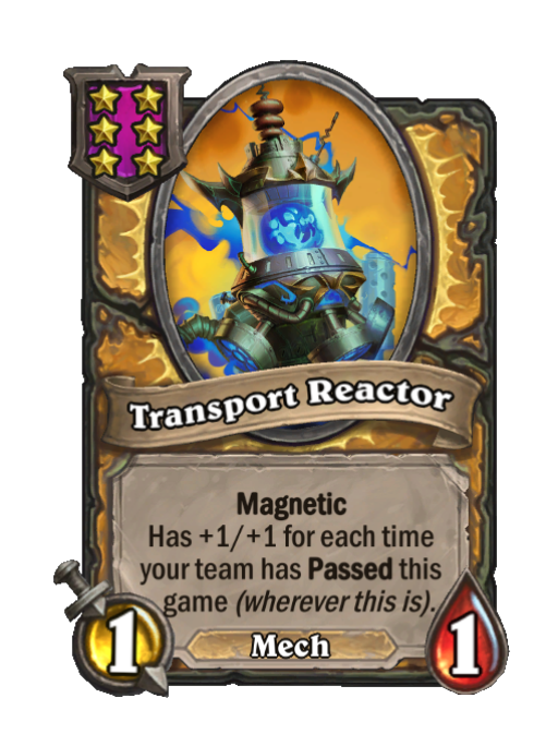 Transport Reactor is a Tier 6 Mech Minion in Hearthstone Battlegrounds with 1/1 stats featuring Aura, Magnetic. Effect: Magnetic Has +1/+1 for each time your team has Passed this ___game (wherever this is).