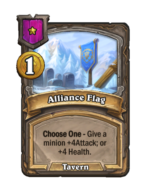 Alliance Flag is a Tier 1 Spell in Hearthstone Battlegrounds (Tavern). Effect: Choose One - Give a minion +4Attack; or +4 Health. Costs 1 Gold. This card is no longer in the pool (Legacy).