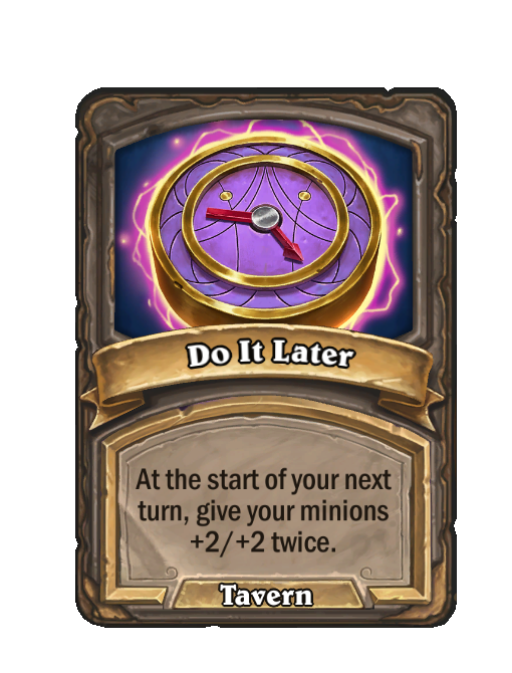 Do It Later is a Spell in Hearthstone Battlegrounds. Effect: At the start of your next turn, give your minions +2/+2 twice. Created by: Time Management.