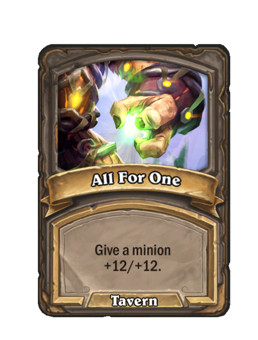 All For One is a Spell in Hearthstone Battlegrounds. Effect: Give a minion +12/+12. Created by: Forest's Bounty. This card is no longer in the pool (Legacy).