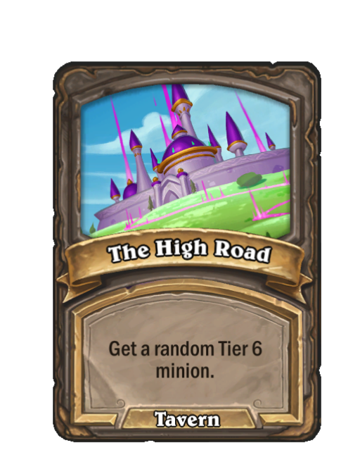 The High Road is a Spell in Hearthstone Battlegrounds. Effect: Get a random Tier 6 minion. Created by: The Road Less Traveled. This card is no longer in the pool (Legacy).