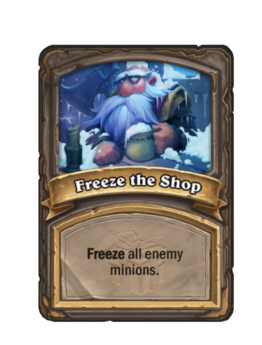 Freeze the Shop is a Spell in Hearthstone Battlegrounds. Effect: Freeze all enemy minions. This card is no longer in the pool (Legacy).