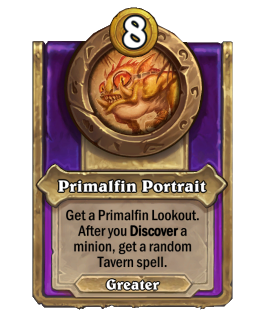 Primalfin Portrait is a Trinket in Hearthstone Battlegrounds. Effect: Get a Primalfin Lookout. After you Discover a minion, get a random Tavern spell. This card is no longer in the pool (Legacy).