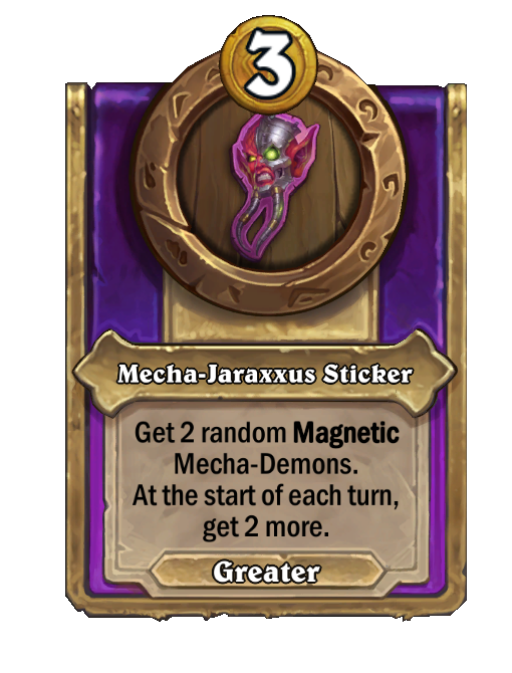 Mecha-Jaraxxus Sticker is a Trinket in Hearthstone Battlegrounds featuring Start of Turn. Effect: Get 2 random Magnetic Mecha-Demons. At the start of each turn, get 2 more.