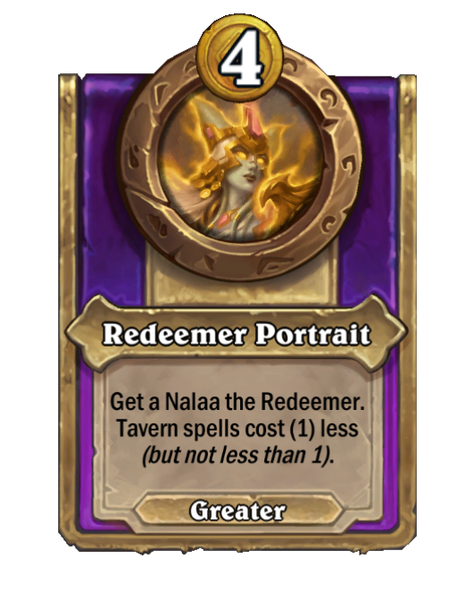 Redeemer Portrait is a Trinket in Hearthstone Battlegrounds. Effect: Get a Nalaa the Redeemer. Tavern spells cost (1) less (but not less than 1).