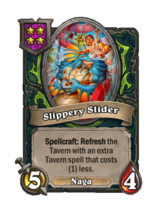 Slippery Slider is a Tier 4 Naga Minion in Hearthstone Battlegrounds with 5/4 stats featuring Spellcraft, Refresh. Effect: Spellcraft: Refresh the Tavern with an extra Tavern spell that costs (1) less. This card is no longer in the pool (Legacy).