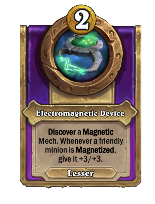 Electromagnetic Device is a Trinket in Hearthstone Battlegrounds featuring Discover. Effect: Discover a Magnetic Mech. Whenever a friendly minion is Magnetized, give it +3/+3. This card is no longer in the pool (Legacy).