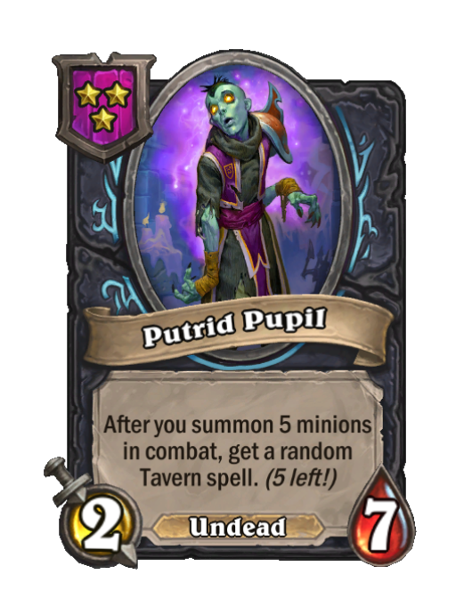 Putrid Pupil is a Tier 3 Undead Minion in Hearthstone Battlegrounds with 2/7 stats. Effect: After you summon 5 minions in combat, get a random Tavern spell. (5 left!). This card is no longer in the pool (Legacy).