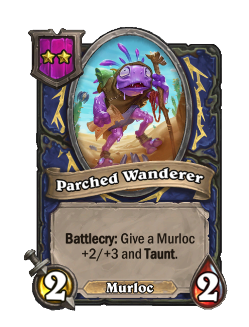 Parched Wanderer is a Tier 2 Murloc Minion in Hearthstone Battlegrounds with 2/2 stats featuring Battlecry. Effect: Battlecry: Give a Murloc +2/+3 and Taunt. This card is no longer in the pool (Legacy).