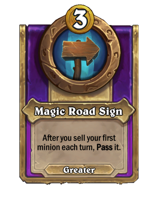 Magic Road Sign is a Trinket in Hearthstone Battlegrounds featuring Pass. Effect: After you sell your first minion each turn, Pass it.