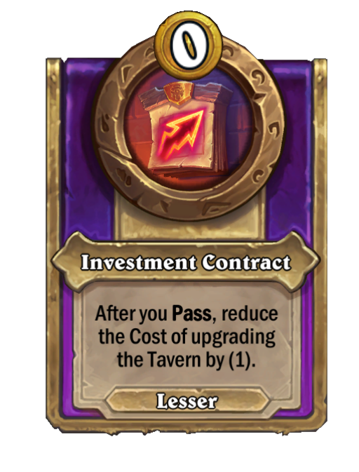 Investment Contract is a Trinket in Hearthstone Battlegrounds. Effect: After you Pass, reduce the Cost of upgrading the Tavern by (1). This card is no longer in the pool (Legacy).
