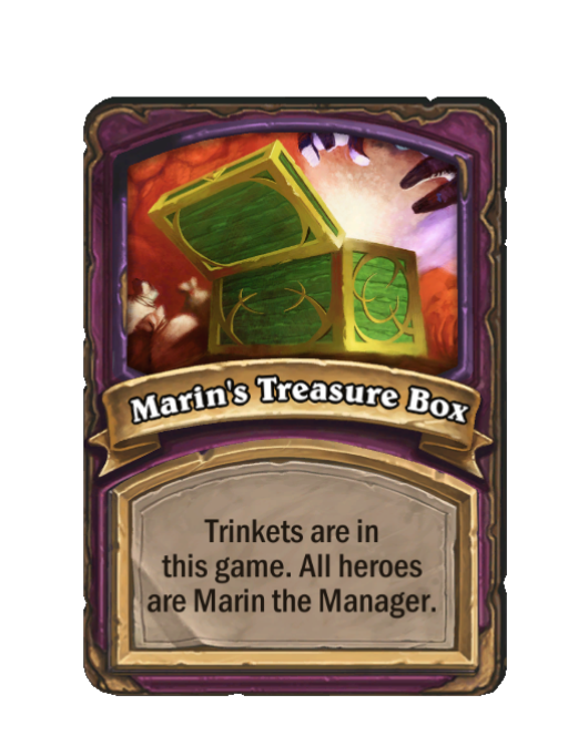 Marin's Treasure Box is a Anomaly in Hearthstone Battlegrounds. Effect: Trinkets are in this game. All heroes are Marin the Manager. This card is no longer in the pool (Legacy).