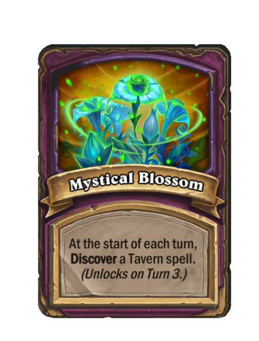 Mystical Blossom is a Anomaly in Hearthstone Battlegrounds featuring Start of Turn, Discover. Effect: At the start of each turn, Discover a Tavern spell. (Unlocks on Turn 3.). This card is no longer in the pool (Legacy).