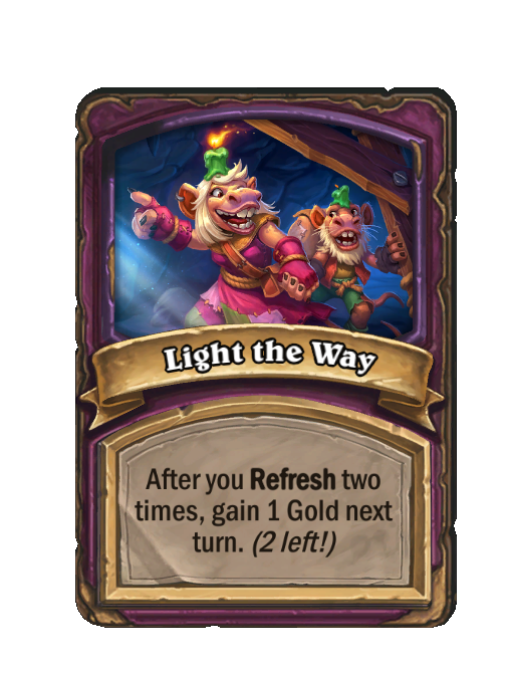 Light the Way is a Anomaly in Hearthstone Battlegrounds. Effect: After you Refresh two times, gain 1 Gold next turn. (2 left!). This card is no longer in the pool (Legacy).