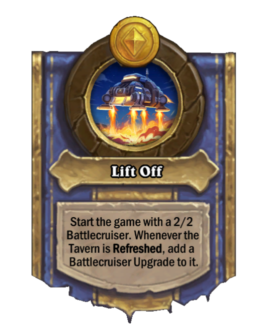 Lift Off is a Hero Power in Hearthstone Battlegrounds. Effect: Start the game with a 2/2 _Battlecruiser. Whenever the Tavern is Refreshed, add a __Battlecruiser Upgrade to it. Created by: Jim Raynor.