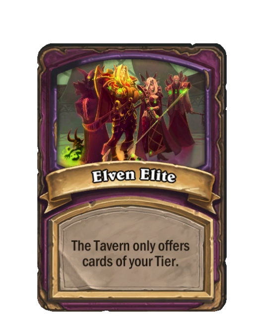 Elven Elite is a Anomaly in Hearthstone Battlegrounds. Effect: The Tavern only offers cards of your Tier. This card is no longer in the pool (Legacy).