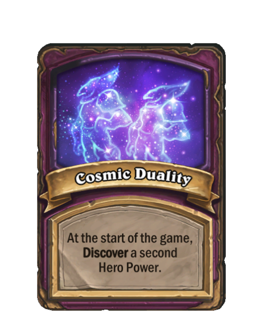 Cosmic Duality is a Anomaly in Hearthstone Battlegrounds featuring Discover. Effect: At the start of the game, Discover a second Hero Power.