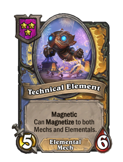 Technical Element is a Tier 3 Elemental/Mech Minion in Hearthstone Battlegrounds with 5/6 stats featuring Magnetic. Effect: Magnetic Can Magnetize to both __Mechs and Elementals.
