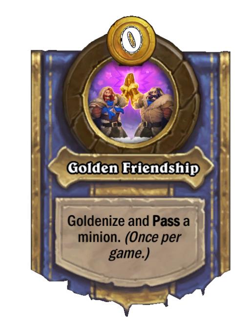 Golden Friendship is a Hero Power in Hearthstone Battlegrounds featuring Pass. Effect: Goldenize and Pass a minion. (Once per game.). This card is no longer in the pool (Legacy).