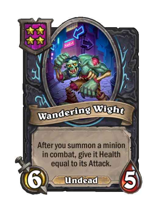 Wandering Wight is a Tier 4 Undead Minion in Hearthstone Battlegrounds with 6/5 stats. Effect: After you summon a minion in combat, give it Health equal to its Attack. This card is no longer in the pool (Legacy).