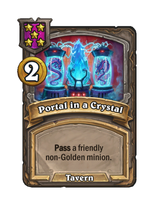 Portal in a Crystal is a Tier 5 Spell in Hearthstone Battlegrounds featuring Pass (Tavern). Effect: Pass a friendly non-Golden minion. Costs 2 Gold.