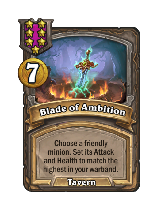 Blade of Ambition is a Tier 7 Spell in Hearthstone Battlegrounds (Tavern). Effect: Choose a friendly minion. Set its Attack and Health to match the highest in your warband. Costs 7 Gold. This card is no longer in the pool (Legacy).