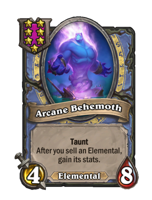 Arcane Behemoth is a Tier 7 Elemental Minion in Hearthstone Battlegrounds with 4/8 stats featuring Taunt. Effect: Taunt After you sell an Elemental, gain its stats. This card is no longer in the pool (Legacy).