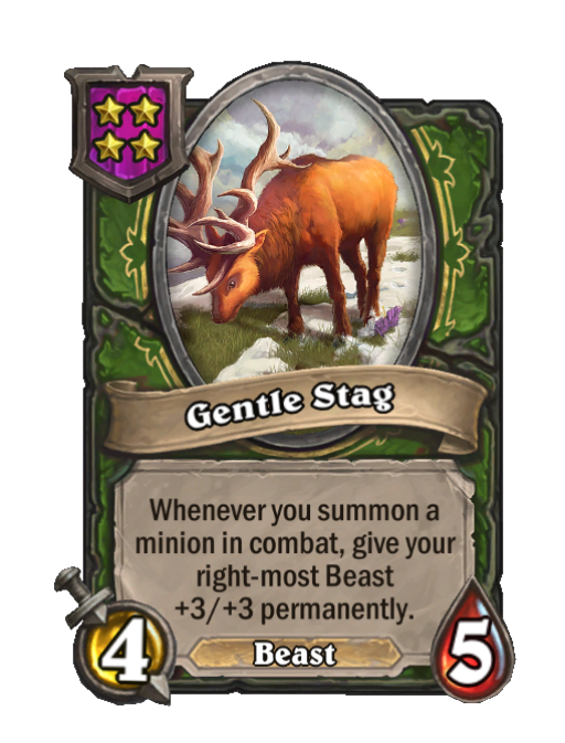 Gentle Stag is a Tier 4 Beast Minion in Hearthstone Battlegrounds with 4/5 stats. Effect: Whenever you summon a minion in combat, give your right-most Beast +3/+3 permanently. This card is no longer in the pool (Legacy).