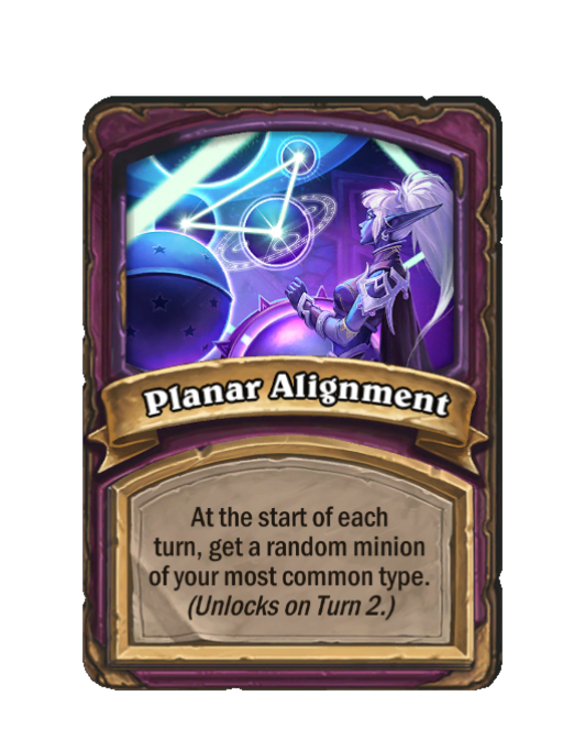 Planar Alignment is a Anomaly in Hearthstone Battlegrounds featuring Start of Turn. Effect: At the start of each turn, get a random minion of your most common type. (Unlocks on Turn 2.). This card is no longer in the pool (Legacy).